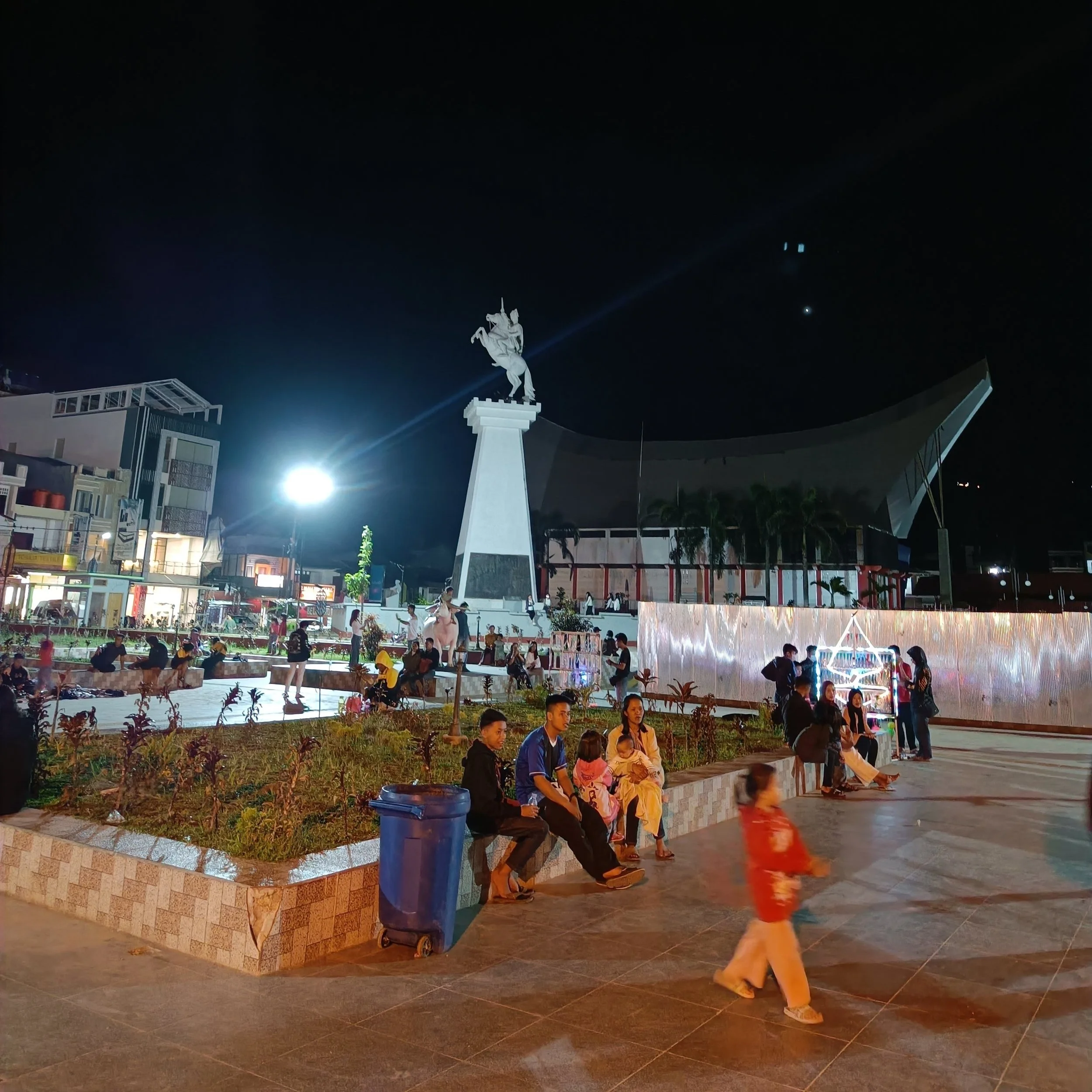 Het centrale plein van Rante Pao, waar families samen de tijd doorbrengen. Op de achtergrond hun held die de Nederlanders verdreef @Glenn Casaer
