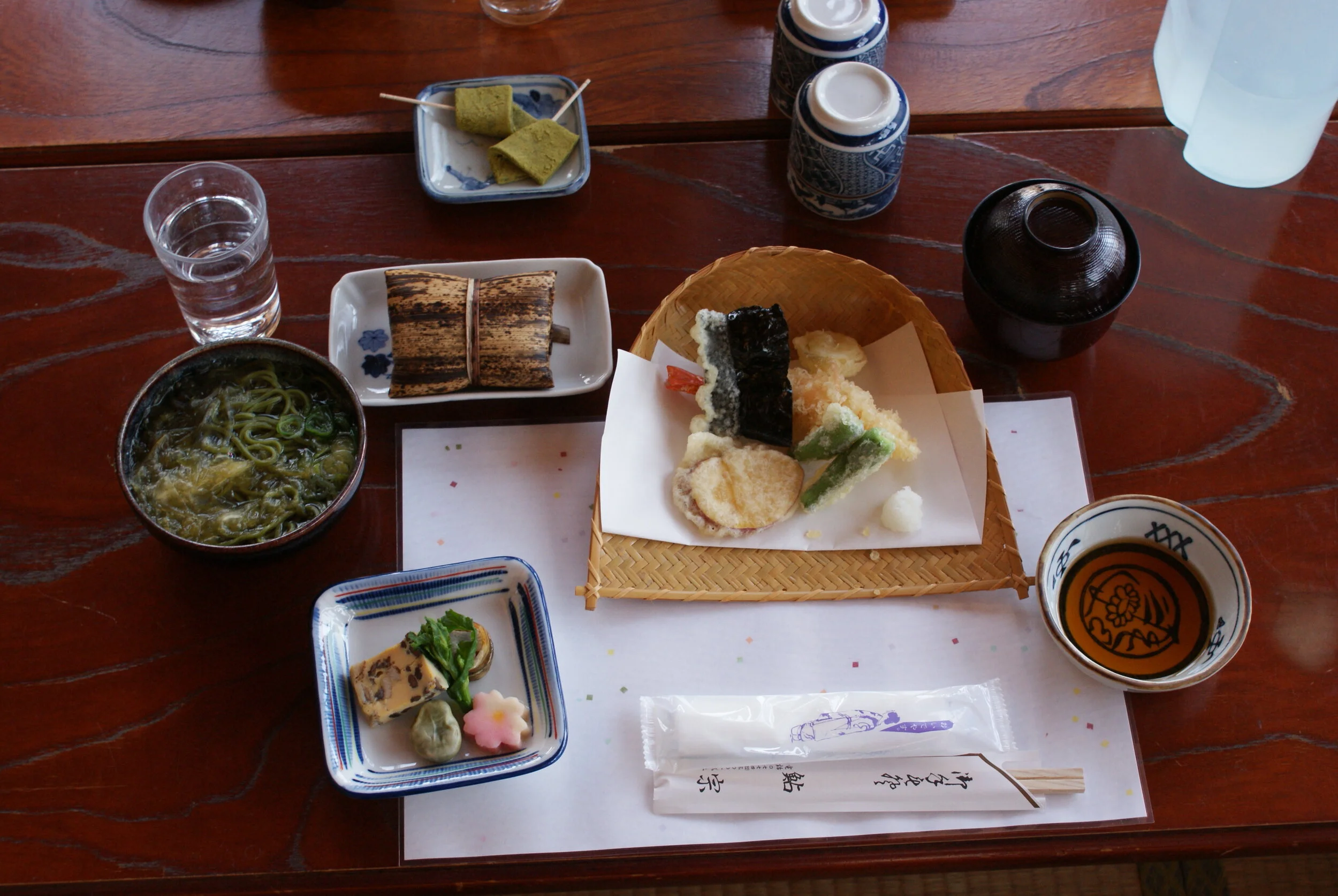 Een Japanse lunch met lokale specialiteiten in een van de restaurantjes langs de rivier